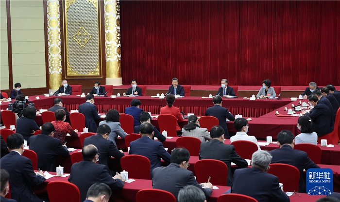 3月6日,中共中央总书记、国家主席、中央军委主席习近平看望参加全国政协十三届五次会议的农业界、社会福利和社会保障界委员,并参加联组会,听取意见和建议。中共中央政治局常委、全国政协主席汪洋参加看望和讨论。新华社记者 鞠鹏 摄