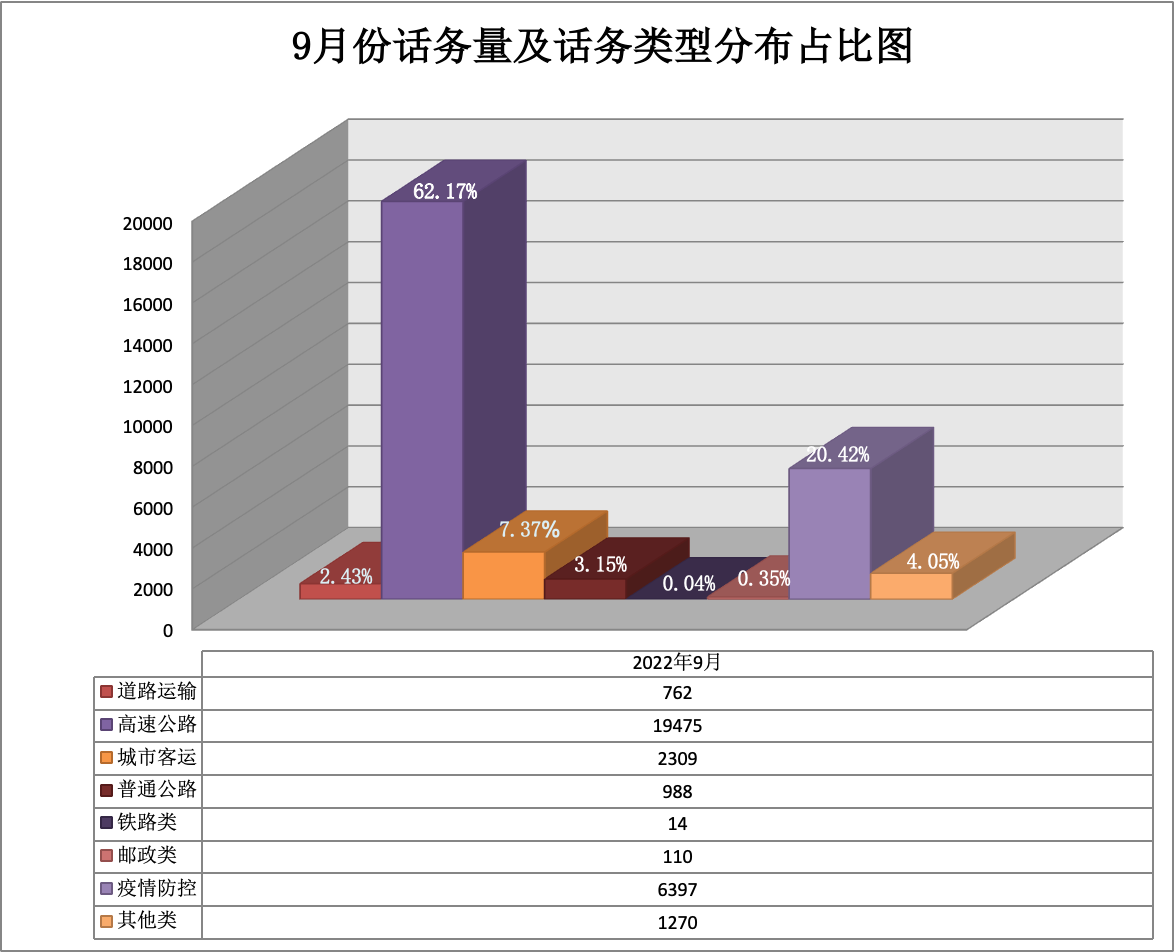 按业务领域划分,本月共受理道路运输类电话762件,占话务总量的2.43%;高速公路类电话19475件,占业务总量的62.17%;城市客运类电话2309件,占业务总量的7.37%;普通公路类电话988件,占业务总量的3.15%;铁路类电话14件,占业务总量的0.04%;邮政类电话110件,占业务总量的0.35%;疫情咨询类电话6397件,占业务总量的20.42%;其他类电话1270件,占业务总量的4.05%。