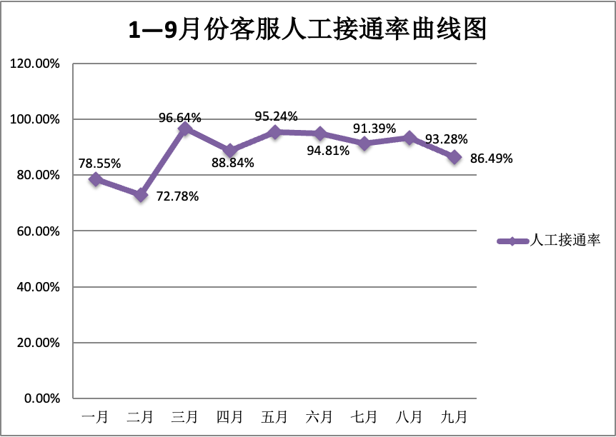 本月人工接通率为86.49%,由于疫情原因,自9月20日以来咨询公路畅通和疫情管控电话量激增,人工接通率环比下降7.28%。1-9月人工接通率对比情况如图所示: