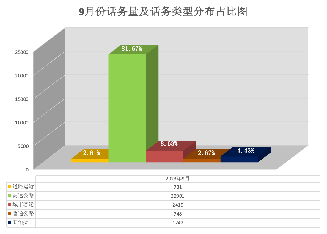 按业务领域划分,本月共受理道路运输类电话731件,占话务总量的2.61%;高速公路类电话22901件,占业务总量的81.67%;城市客运类电话2419件,占业务总量的8.63%;普通公路类电话748件,占业务总量的2.67%;其他类电话1242件,占业务总量的4.43%。